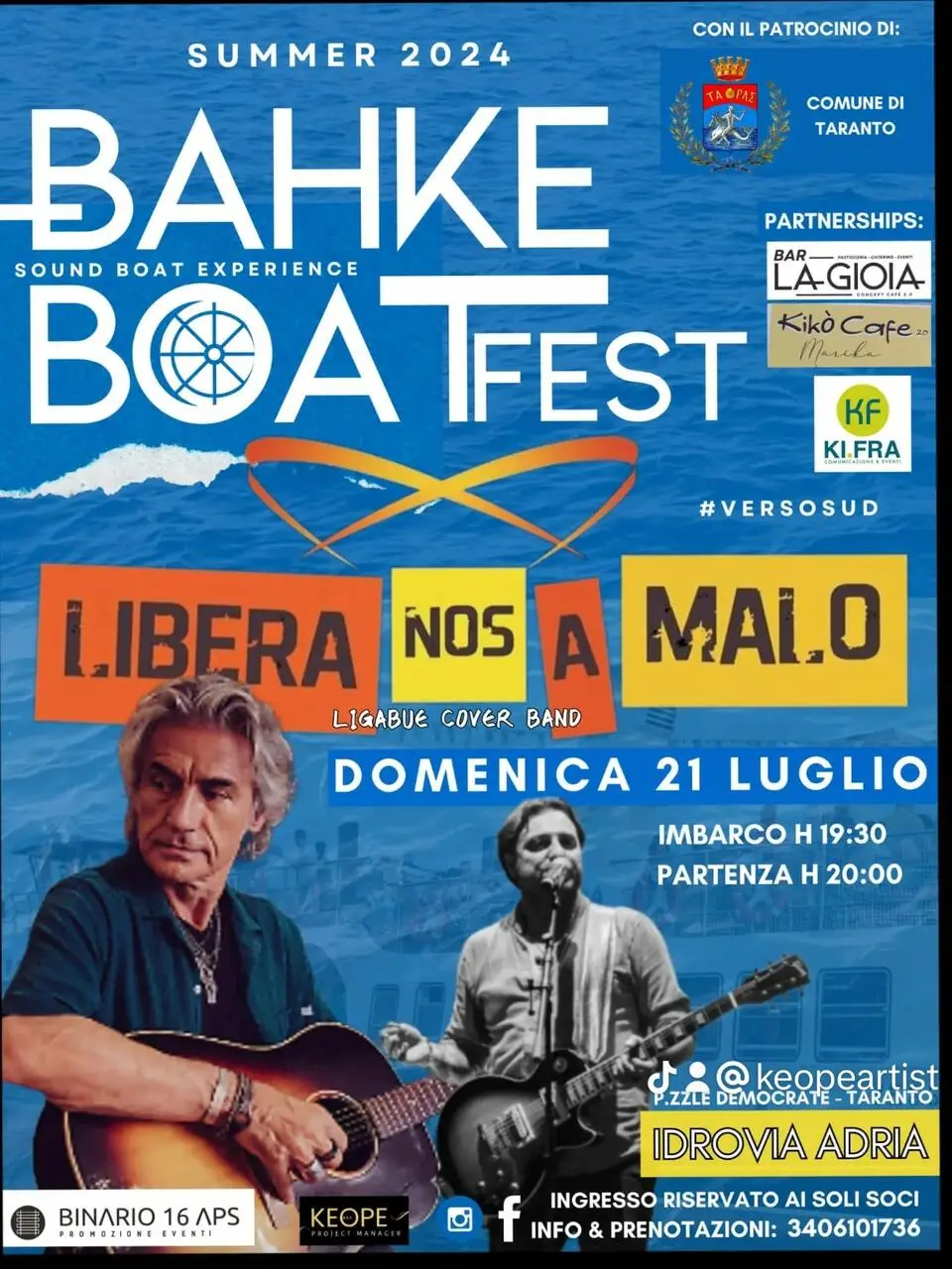 Domenica 21 luglio si comincia con i “Libera nos a malo”, tra le tribute band di Ligabue più importanti a livello nazionale, ospiti dell'idrovia di Kyma Mobilità Adria: l'imbarco è previsto per le ore 19:30, la partenza è alle 20.