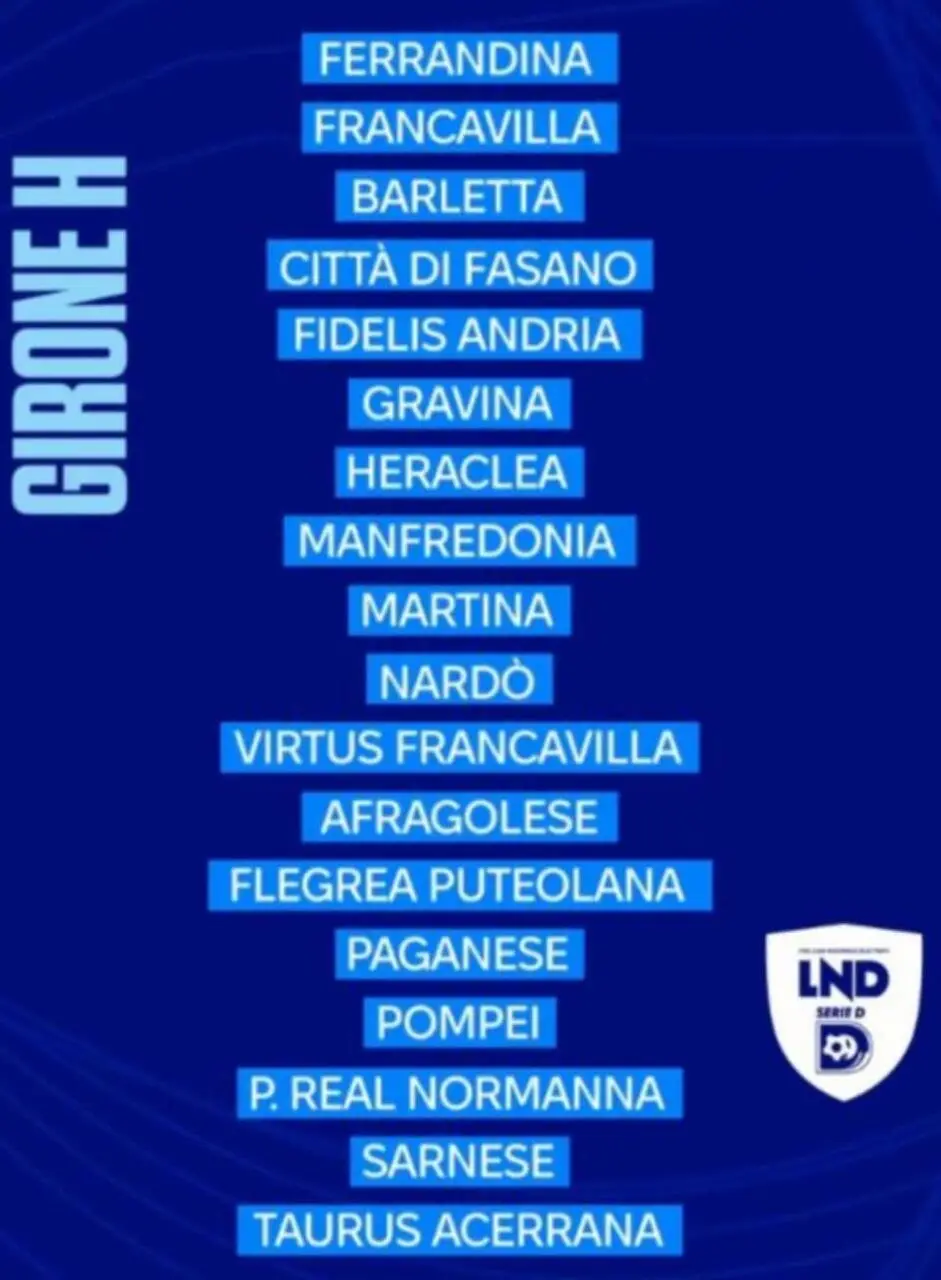 Nella giornata di lunedì 4 agosto sono stati diramati i nove gironi di serie D. Ecco quello H che vede 8 pugliesi, 3 lucane e 7 campane.
