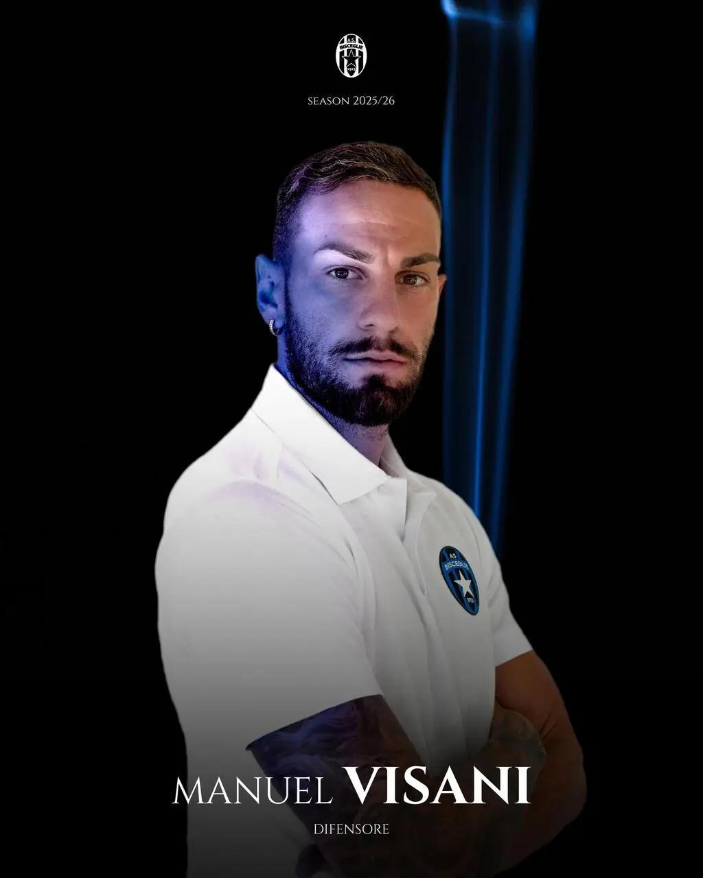 Nato il 27 gennaio 1999, Visani è arrivato lo scorso campionato nel Bisceglie Calcio per dare il proprio contributo al centro della difesa, collezionando ben 34 presenze tra partite di campionato, Coppa e playoff. Manuel ha ha esordito con la maglia stellata il 19 settembre nella partita di Coppa Italia contro il Barletta, da ex, e da quel momento è diventato uno dei pilastri della squadra stellata. Fisicamente strutturato e dotato di intelligenza tattica, Visani ha espresso tutte le sue qualità in campo, diventando un punto di riferimento costante per i propri compagni e mostrando anche una personalità da leader nei momenti cruciali della scorsa stagione. Dedizione, sacrificio e senso di appartenenza sono le caratteristiche principali del difensore che sarà pronto a sostenere con tutte le sue forze la causa nerazzurro stellata anche nella stagione 2025/2026.