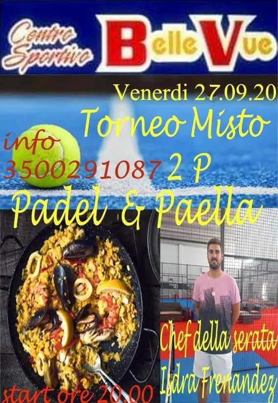 Ancora una grande iniziativa di padel al Centro Sportivo “Belle Vue”. Venerdì 27 settembre si terrà “Padel e Paella” torneo misto 2P. “Chef” della serata il Maestro Isdra Fernandez. Una serata da non perdere. Per maggiori info chiamare il 3500291087.
