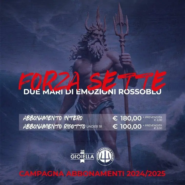 La Gioiella Prisma Taranto lancia la nuova campagna abbonamenti per la stagione 2024/2025, intitolata “Forza Sette: Due Mari di Emozioni Rossoblù”. Un titolo evocativo che richiama la forza e la resistenza necessarie per affrontare un mare forza sette, con onde imponenti che raggiungono dai 6 ai 9 metri, simile alle sfide che attendono la squadra nel prossimo campionato di Superlega.