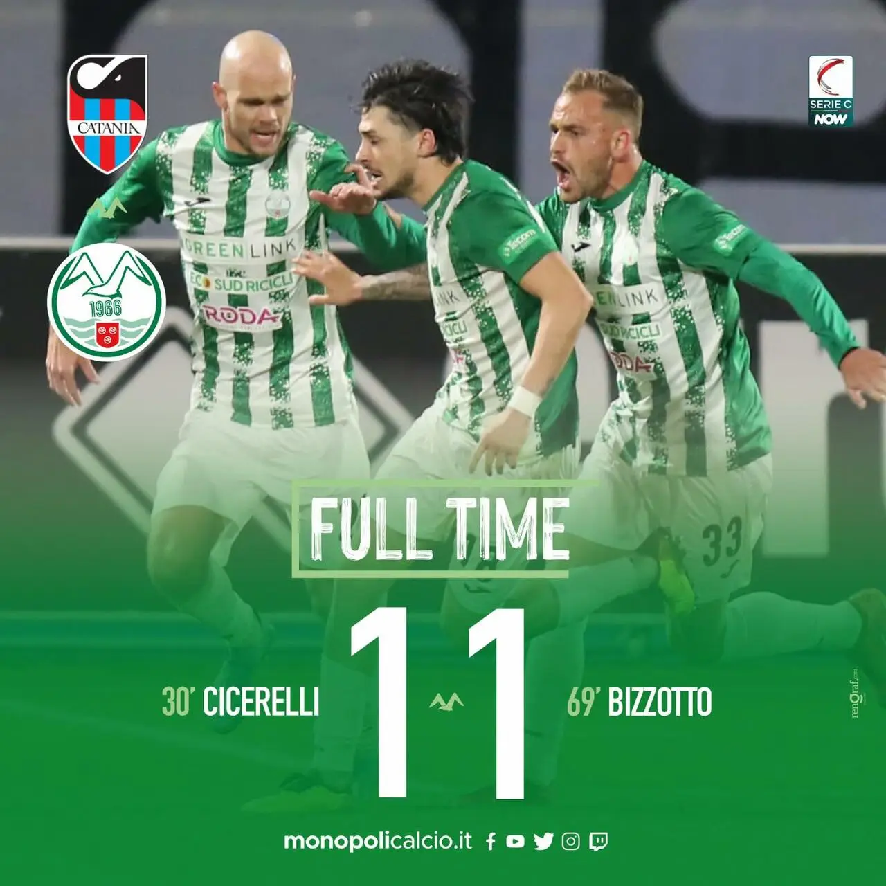 Monopoli (3-4-2-1): Gelmi; Fazio, Bizzotto, Ferrini; Viteritti, Hamlili, De Risio (17′ st Bulevardi), La Vardera (30′ st Barlocco); Borello (30′ st De Paoli), Arioli (17′ st Vitale M.); Tommasini (40′ st Angileri). All.: Taurino. A disp.: Botis; Fornasier, Cristallo, Iaccarino, Peschetola, Sosa, Spalluto, Simone.