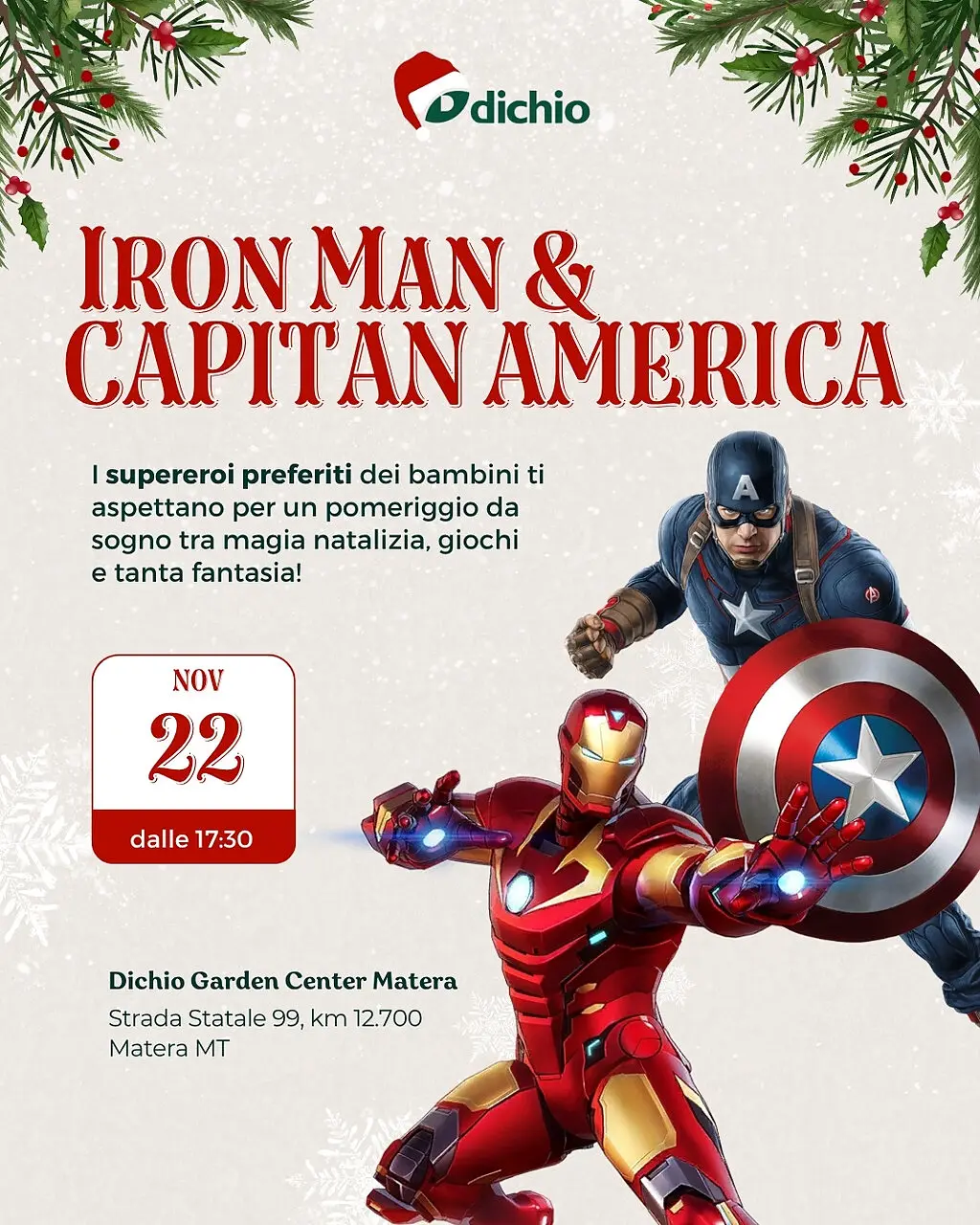 Inizia il magico periodo natalizio dell’Associazione Gio’ Gio’ e i Supereroi con Iron Man e Capitan America che il 22 novembre, giorno di Santa Cecilia, dalle 17:30, presso Dichio Garden Center a Matera faranno divertire grandi e piccini con la possibilità di scattare tante foto. Vi aspettiamo numerosi per inaugurare insieme le feste natalizie 2025.