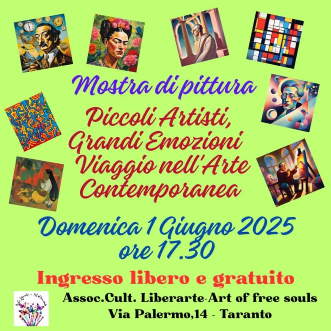 L’Associazione Culturale Liberarte-Art of free souls, sita in Via Palermo 14 a Taranto, domenica 1 giugno dalle 17:30 vi invita tutti alla mostra di pittura “Piccoli Artisti, Grandi Emozioni - Viaggio nell’Arte Contemporanea.